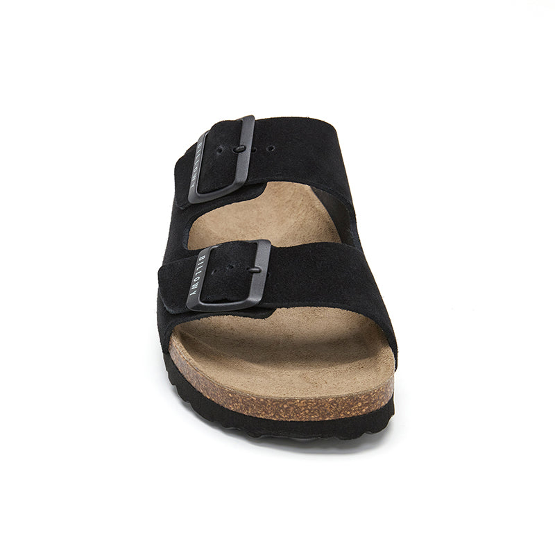 Cowhide suede sandal with two straps, each with a metal buckle for individual adjustment.