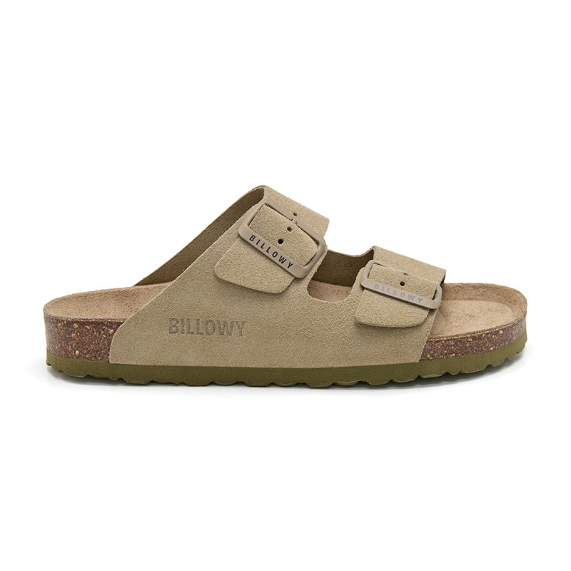 Cowhide suede sandal with two straps, each with a metal buckle for individual adjustment.