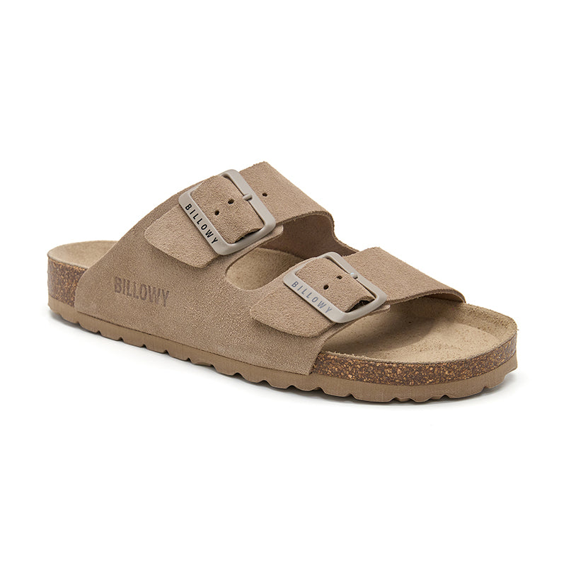 Cowhide suede sandal with two straps, each with a metal buckle for individual adjustment.